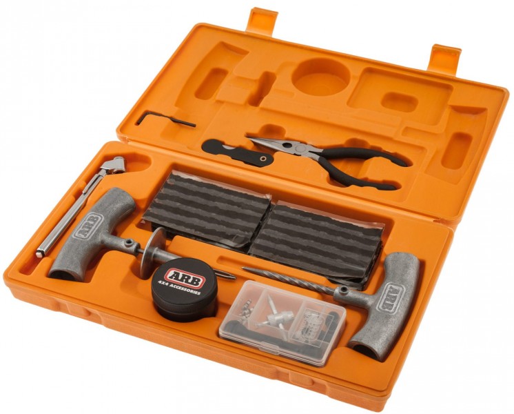 Pro případ defektu pneu mimo obvyklou síť servisů dodává ARB (Austrálie) opravnou sadu pro bezdušové pneu ve stabilním kufru.