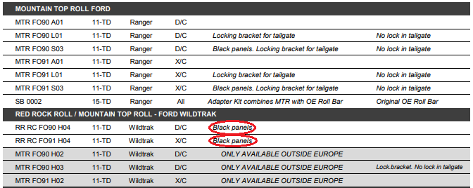 Tento rolovací kryt v černém provedení od dánského výrobce Mountain top se prodává pod názvem Red Rock roll, viz aplikační tabulka na obrázku.